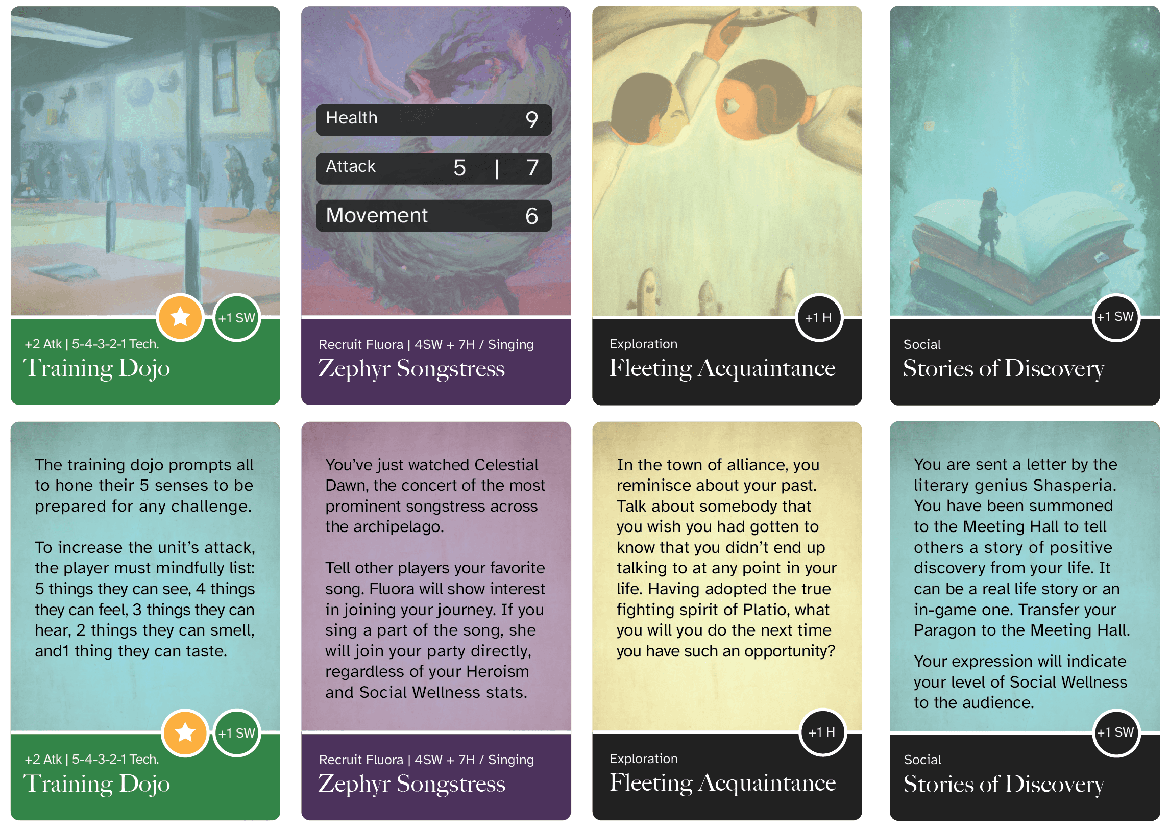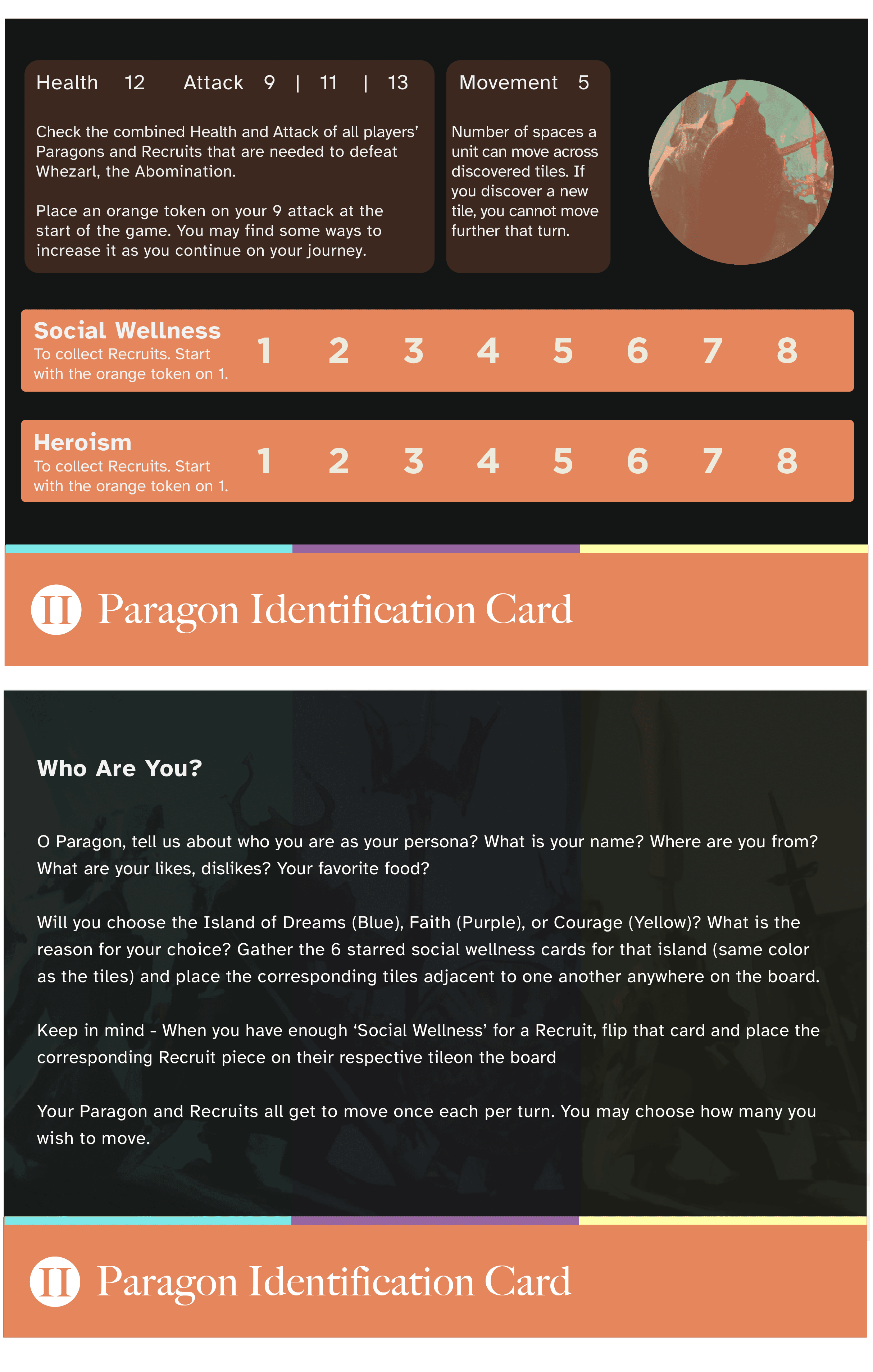There are 6 Paragon Identification Card, one for each player. They are used to keep track of a players 'social wellness' and 'heroism' statistics. These stats are cultivated by performing the activities on the social wellness prompt cards. Heroism was added as surveys and interviews suggested that individuals would feel socially well and confident as heroes. The cards also ask players to introduce themselves, engaging with the 'expression' guiding principle.