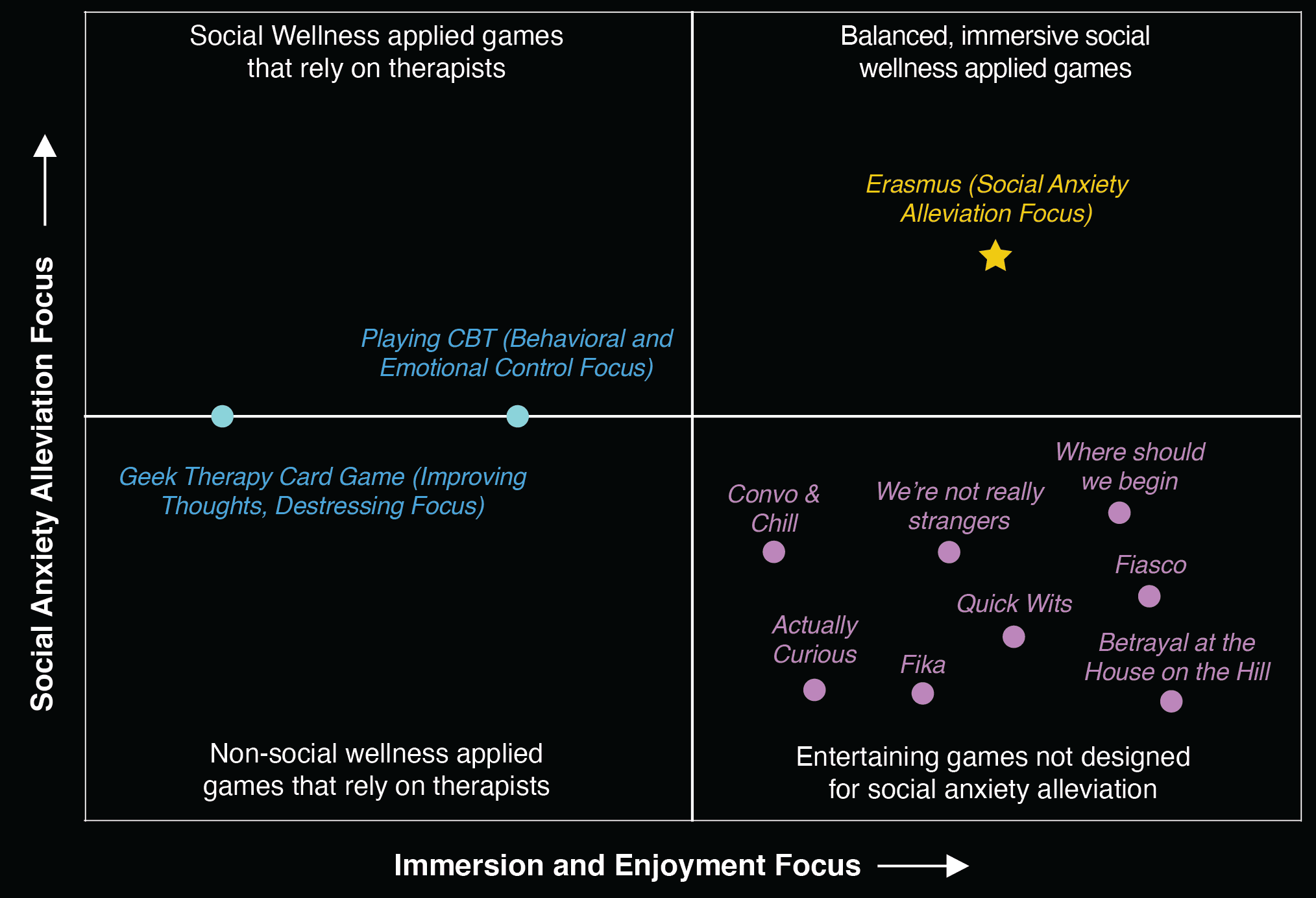 The final result is a fully playable applied board game for between 2-6 players. It takes around an hour to complete, and has been deeply infused with the 10 guiding principles for social wellness. The thesis paper was a success. The next step is to refine the gameplay of the board game even further, after which it will be sent for clinical trials for social wellness. The findings indicate that there is a prominent linkage between social anxiety alleviation and applied board games and much potential for social anxiety alleviation. No applied games were discovered that were specifically designed to alleviate social anxiety. Commercial games possess slivers of unintentional social anxiety alleviating elements. Erasmus, which is possibly the first design of its kind, has been developed through 10 carefully researched social wellness promoting guiding principles. Participants both helped develop and responded well to these guiding principles as well as the physical and content aspects of Erasmus. They displayed and responded with positive results in terms of social wellness. Their readiness and comfort to perform conversational as well as challenging social wellness activities, was much higher towards the end of the interventions than at the beginning. This indicated that as the game progressed, they displayed higher levels of social wellness. Some displayed bigger improvements than others. A key takeaway from the design is that the literature analysis suggested balancing social wellness boosting aspects with entertainment to immerse the users. This was different from observed studies in the literature review, and the balance helped achieve positive results through participants. Erasmus was able to elicit ‘courageous’ behaviors from participants with social anxiety as they were able engage with the game to adopt personas, express, sing, dance, learn grounding techniques and coping skills, converse openly with other players, affirm other participants, and perform self-affirmations. Multiple participant responses indicated higher levels of overall social comfort and wellness.
