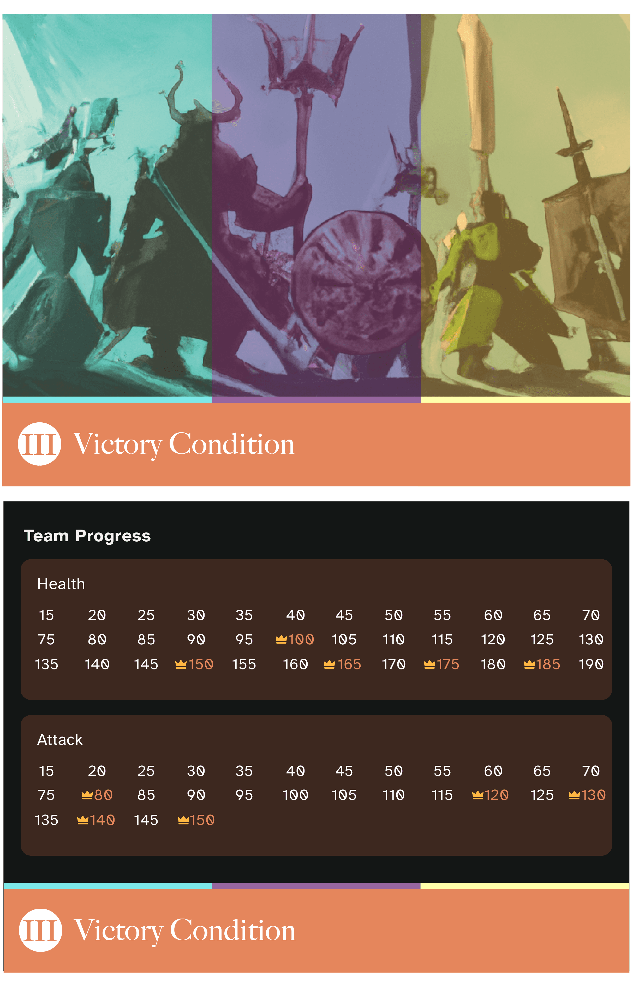 The final introductory card is the Victory Condition Card. It helps to keep track of players' combined social wellness and heroism statistics. Once the players achieve certain cumulative statistics on this card (depending on how the game is being played), they will automatically defeat the abomination and win. To achieve victory, multiple social activities will be performed by players through the social wellness prompt cards.