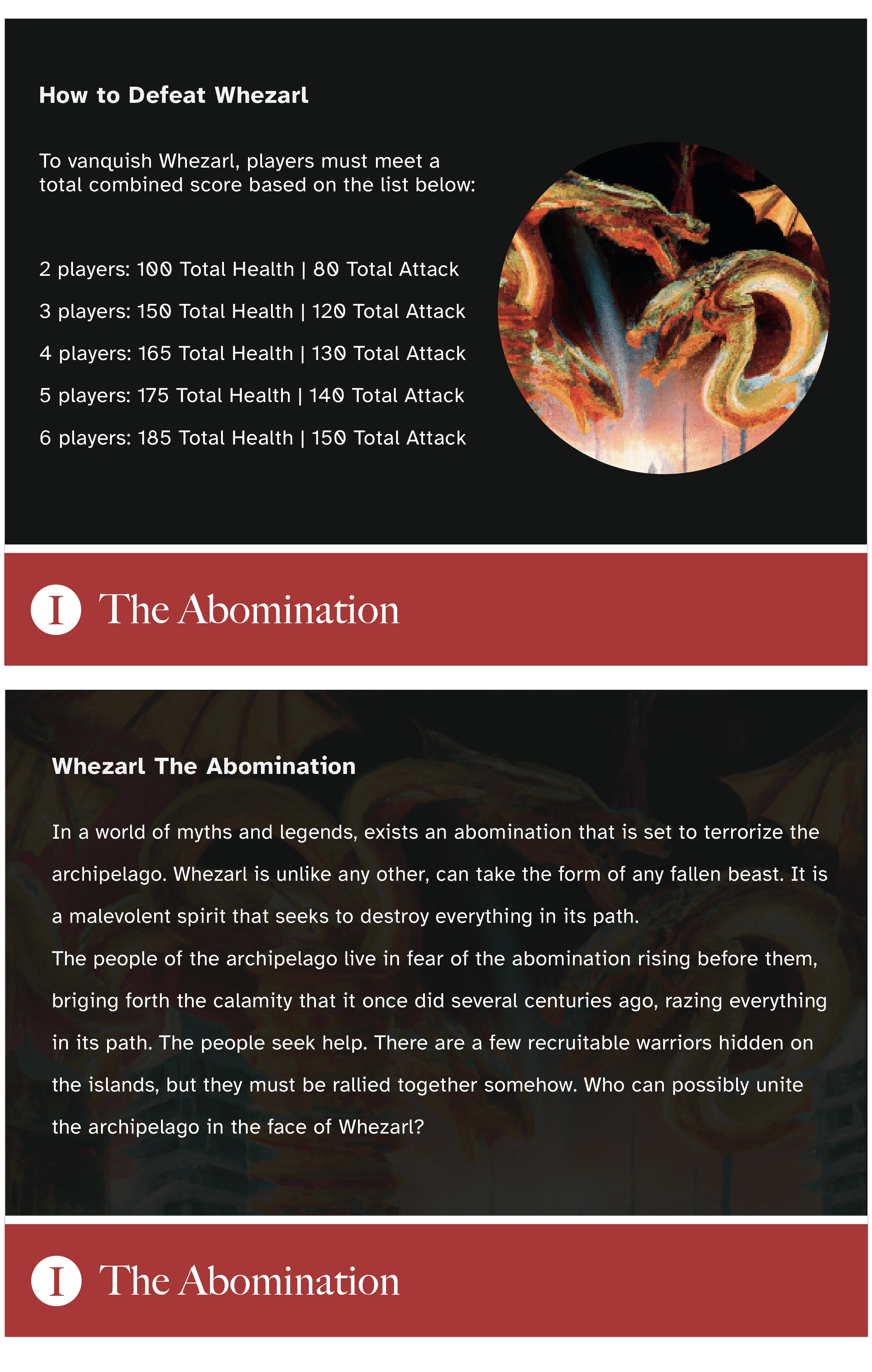 Since one of the guiding principles for Erasmus is a 'carefully crafted story', the 'abomination' serves as the villain that all players must take down together to save the 3 boards/islands of the archipelago. This aligns with other principles like 'heroism', 'collaboration', and more.