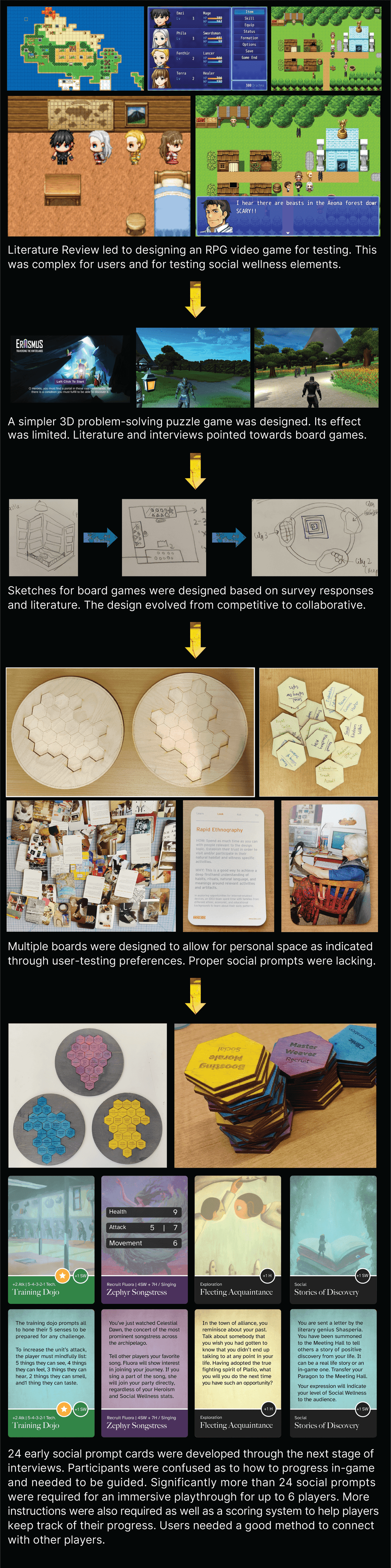 The ideation and prototyping process was done in reaction to a two stage literature review ('data gathering' and 'game system development'), 32 surveys, 16 modular user-testing interviews, and 3 full-length game focus group tests with a total of twelve participants. Throughout the process, the prototyping evolved several times, as shown below.