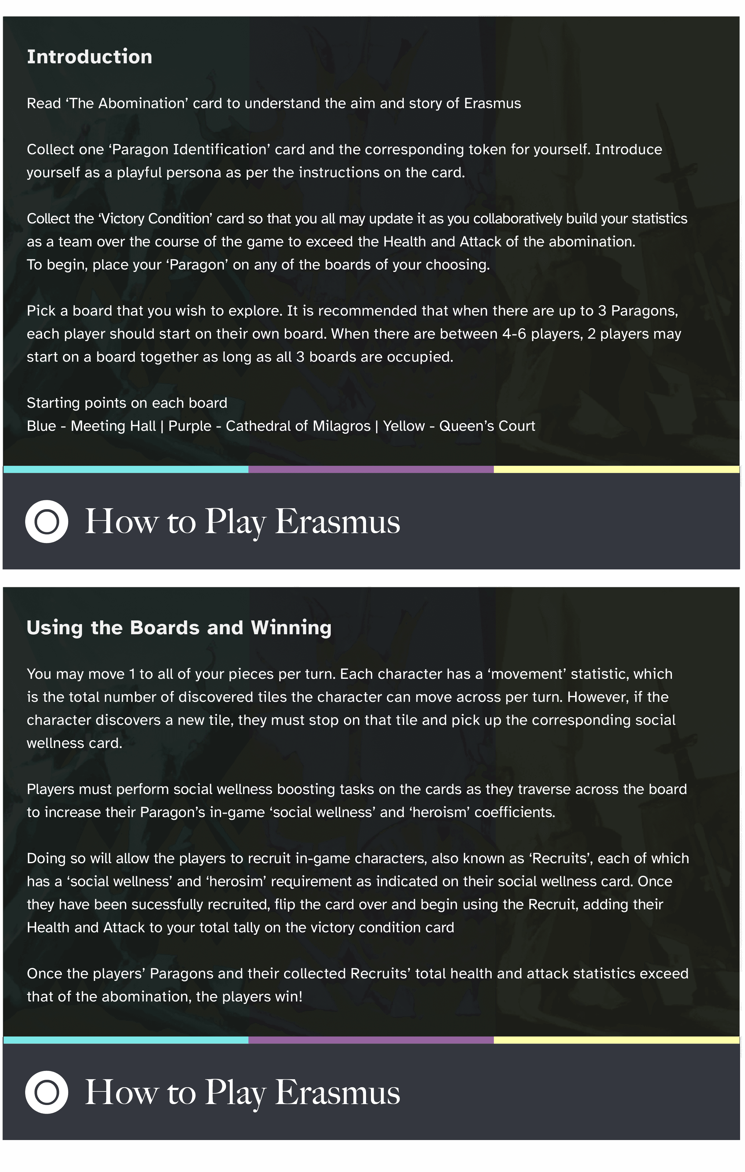 The players needed to be guided by me for the initial playthroughs as the game is complex and therefore, not intuitive on its own. An instructions card was designed to help players engage with Erasmus step by step.