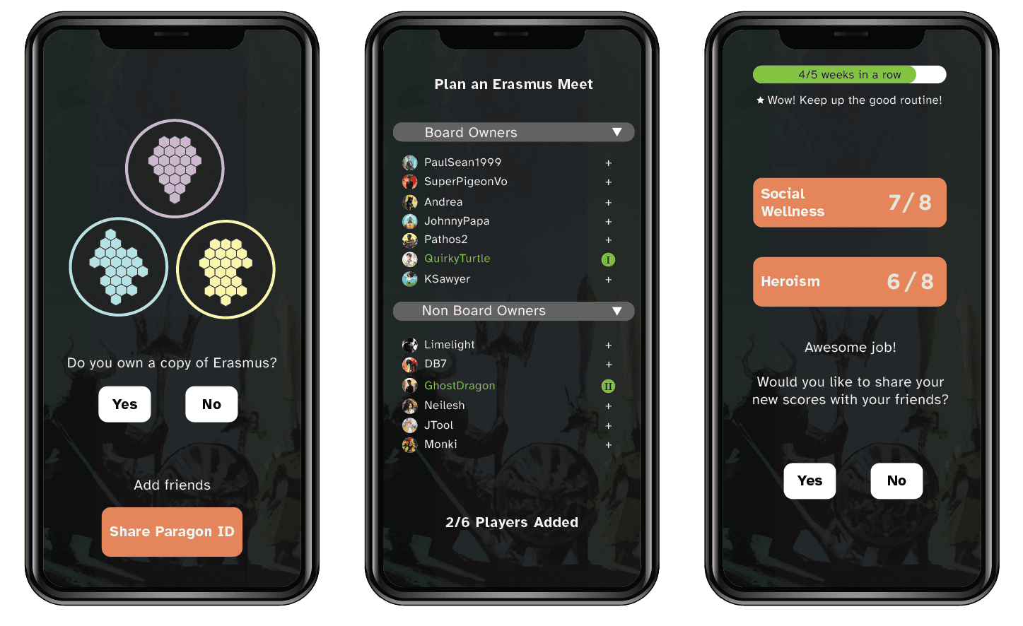 Supporting mobile app for users. Users with social anxiety may download the app and add friends. This will allow users to form a community. Since each playthrough of Erasmus ends with a collaborative score, users can post their scores on the application, promoting engagement with the game.