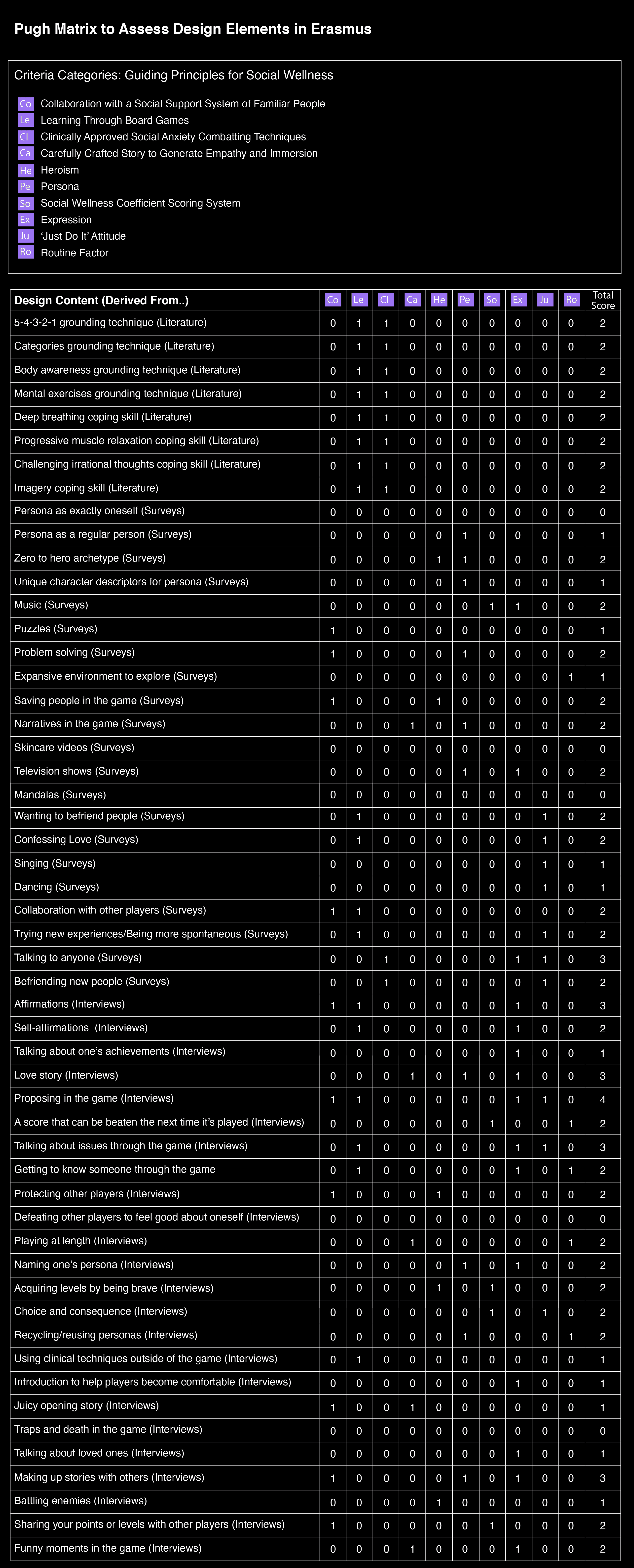 The Pugh matrix is a variable selection tool that helps determine which design content to choose from multiple options and is useful for big data lists decision-making processes. The specialized Guler and Petrisor’s Pugh matrix has been derived to assist small teams calculate variables and focuses on designing products to penetrate the market. The Pugh matrix for Erasmus uses design content gathered from all stages of literature and were also hand-picked from participant responses. The content is systematically plugged into the matrix to test for criteria matches against the 10 guiding principles that were derived for Erasmus. The same can be made clear in the table displayed below. The criteria matches were used design the content in the 78 social wellness prompt cards for Erasmus, which became the crux for boosting social wellness for users while keeping the experience fresh every time the applied game is replayed.
