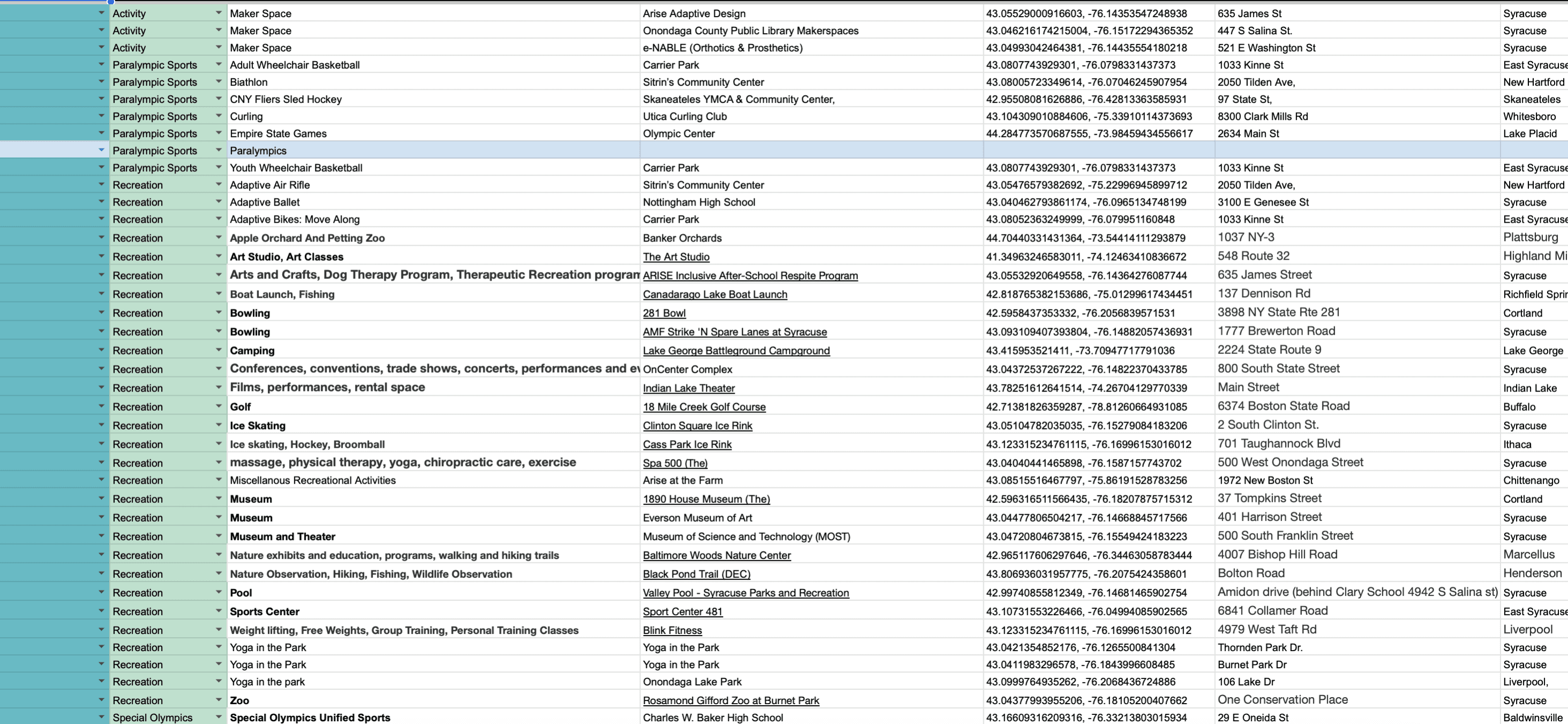 Over 200 accessible facilities were discovered in Central New York, and were categorized them into leisure, outdoor activities, sports, restaurants, maker-spaces. Since all of these places existed, it was important to understand the relationship that people with disabilities had with these facilities. Surveys were sent out to individuals with disabilities, asking them if they knew about and participated at prominent accessible spaces in Central New York. These surveys were handed sent out electronically, and filled out in-person at the Human Performance Insitute, Syracuse University Community Center, as well as by clients of the Doctors of AT Village. Through this, we our research problem evolved from 'the lack of accessible spaces' to 'the lack of understanding of the existence of accessible spaces and how to locate them'.