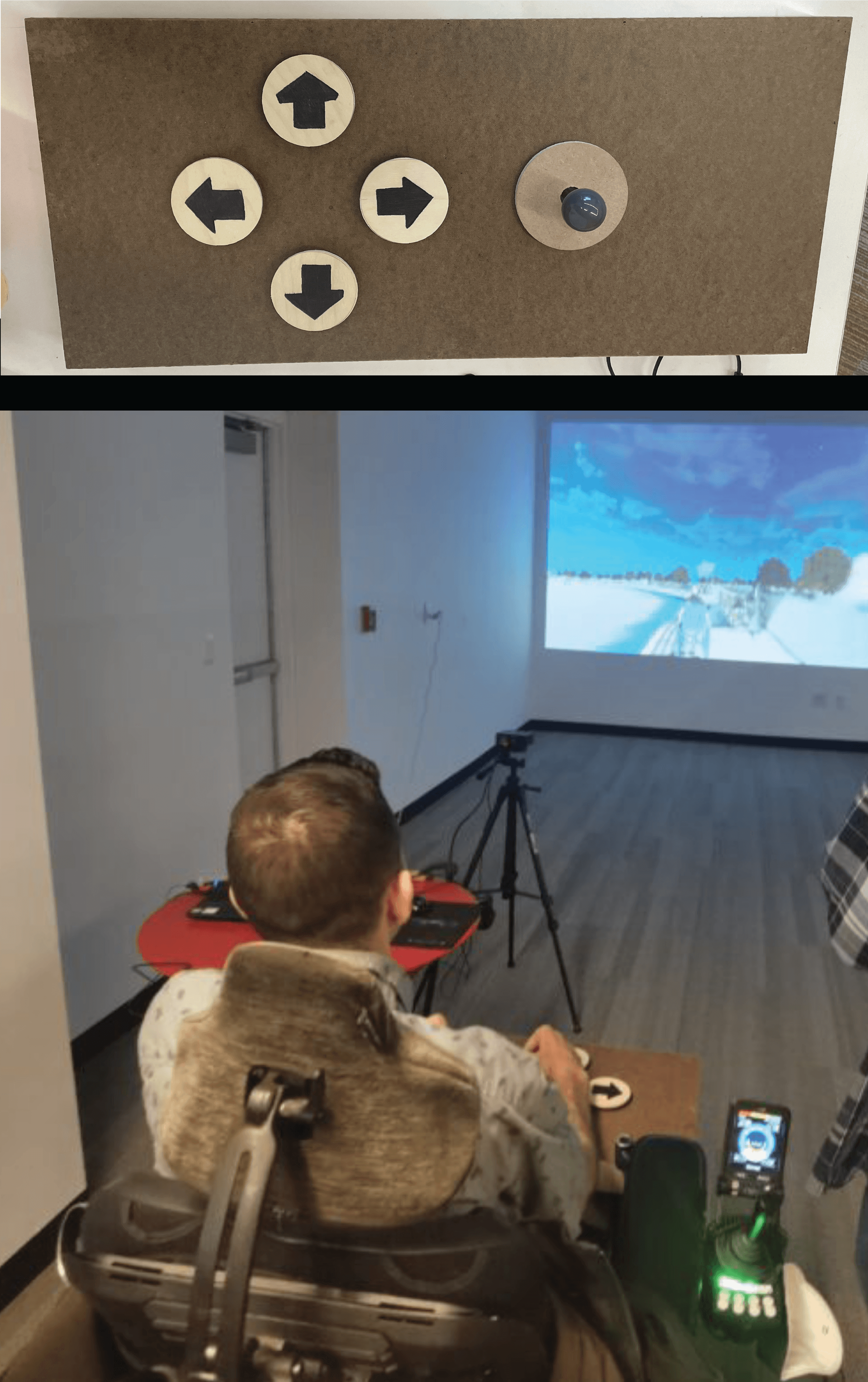 It was apparent early in research that a controller interface for the game would greatly improve the user experience and expand the population of potential users. Within the user testing context, no on-the-market controllers were both compatible with the development software and adaptive. To solve this problem, a PXN 0082 Arcade Fight Stick Joystick was purchased from a large department store in Syracuse, NY. This was first utilized at the Fit-In conference, where a number of users were able to test the game and explore the Lidar mapped creekwalk as an early prototype. While this was an improved interface, the controller was still not adaptive and had too many buttons for the use case. The PXN 0082 was then re-configured as a low fidelity adaptive controller, with a larger housing and only 4 large (3” diameter) buttons for intuitive use. This process improved the UX significantly and improved the game’s accessibility as it allowed for a seated ability collaborator to play the game.
