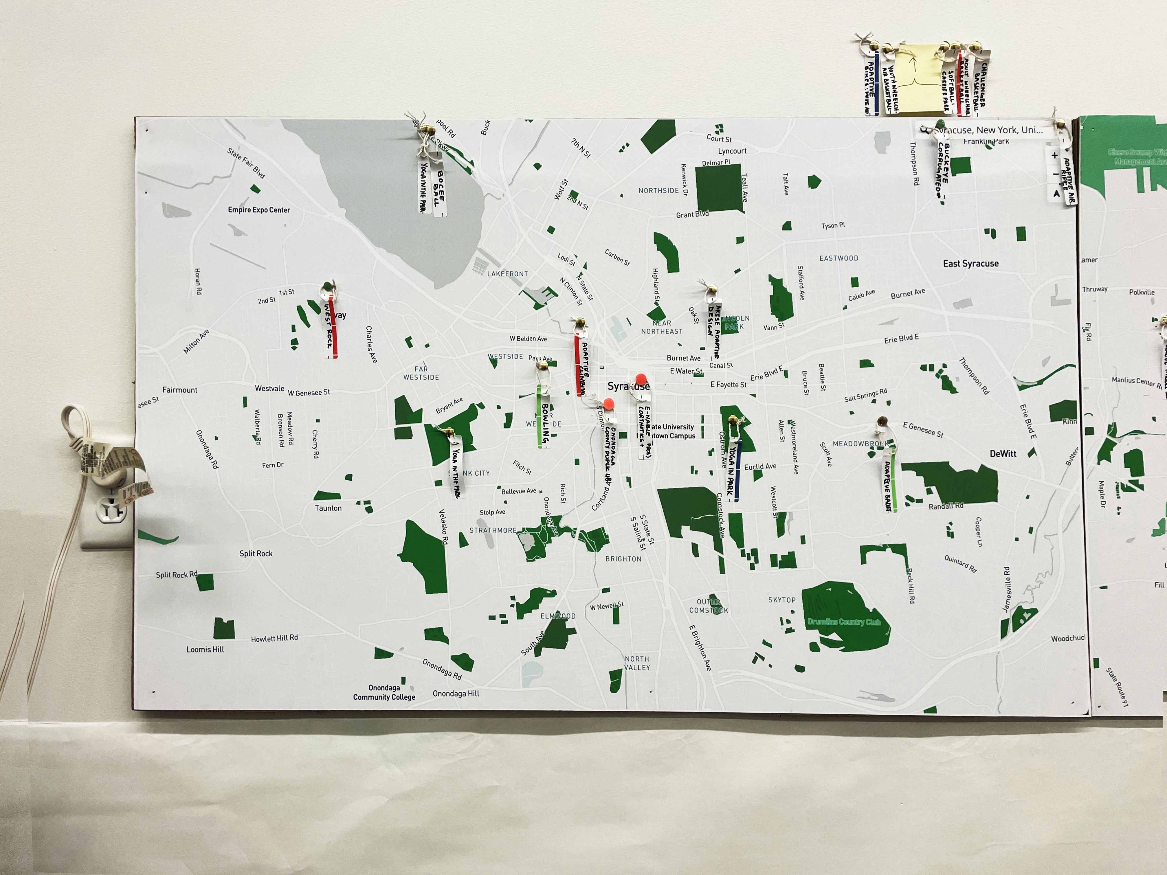 The team began to pin notable locations on a physical map in Central New York. These locations were then collated into a Qualtrics survey that was sent out to individuals with disabilities in Central New York. A large amount of the recipients of the survey were associated with organizations like Move Along, Arise Adaptive Design, and the Human Performance Institute. Here were some common responses across surveys: - A brochure or QR code linked to a list of activities and information about the activities, equipment availability, and hand bikes. - All of the examples above as well as a brochure or QR code linked to a list of programs and information about the activities. - Charging stations, paved platforms and pavilions for picnicking, accessible picnic tables, accessible hiking paths (hard firm gravel or paved paths), accessible bike paths/routes and an accessible bike rental program would be amazing, accessible boat launch for canoeing or kayaking, plenty of accessible parking, accessible charcoal grills, accessible playground. - If interactive, a filter for disability type and what programs are offered for that specific disability, (ex-blind versus deaf versus quadriplegia). Travel time and something that notes if it's along a bus route would be helpful. - The accessibility of the activity, how to get there, travel time. - Adaptive equipment loans/ rentals, where programs are housed and a link to a calendar of events, accessible pathways in communities and through green spaces (links to Inclusive Recreation Resource Center's database). - Awareness about accessibility.